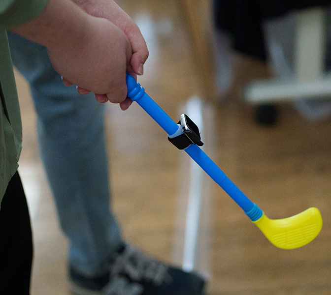 Apple Watch を取り付けたおもちゃのクラブをスイングしてショットを行い、