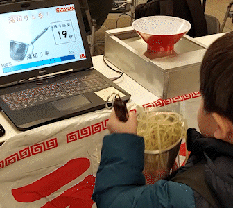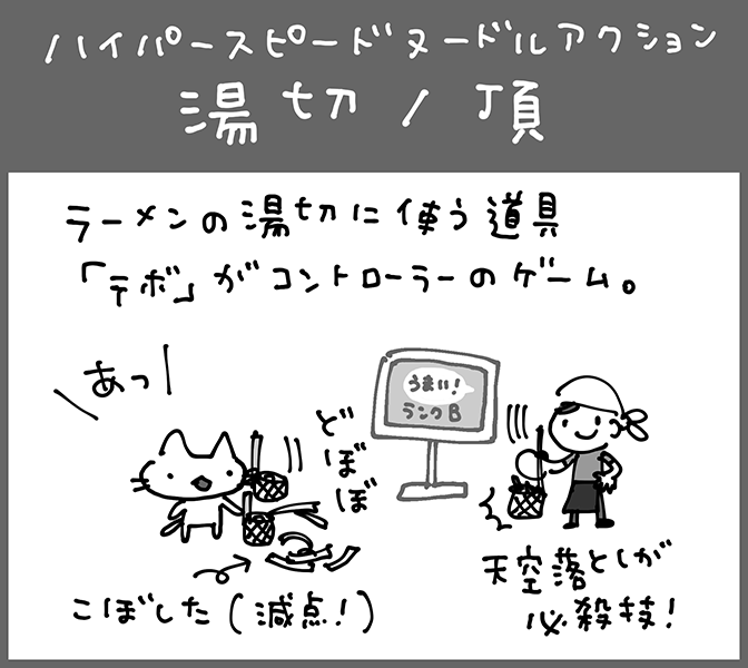 麺をこぼさないように素早く湯切りをするゲームです。