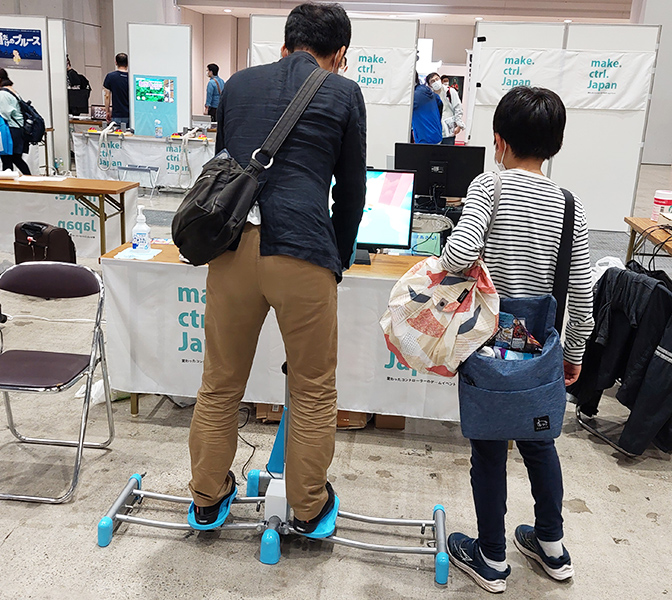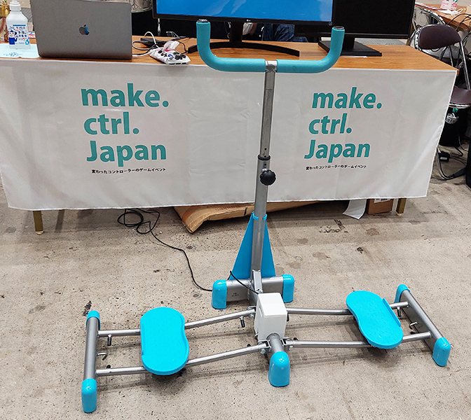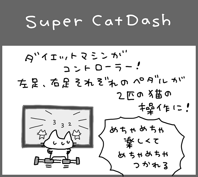 ダイエットマシンを用いた体感ゲームです。プレイヤーが足を閉じたり開いたりすると、それに合わせて画面の中のキャラクタが動きます。