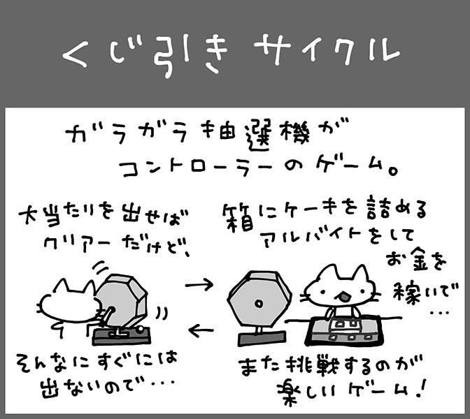 バイトをしてお金を稼ぎ、稼いだお金でくじを大量に引いて0.1%の大当たりを目指すゲームです。ガラガラ抽選機の形をした『くじ引きコントローラ』を回しまくって、サイクルの虜になってみてください!