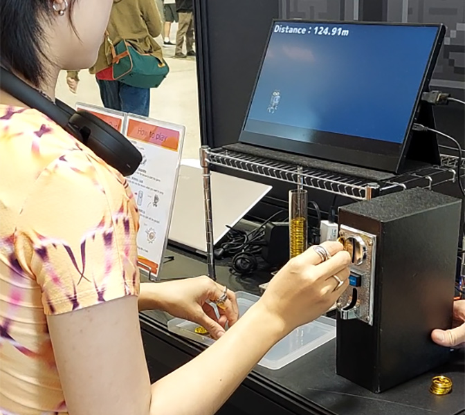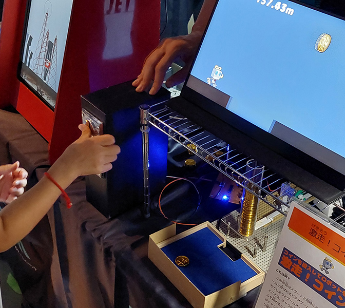 おもちゃのコインを投入することでキャラクターをジャンプさせるランゲームです。操作方法はコインを入れるだけなので、誰でも遊べます!